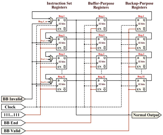 The hardware implementation of two-stage registers for the checkpoint-rollback operation is presented in Figure 8, which also is a specific hardware implementation detail of Figure 4. We additionally configured the proposed two-stage registers for buffering and backing up all the values of the instruction set registers. In each stage, thirty-two 32-bit registers are configured to back up all the values of the instruction set registers (including the IR register).