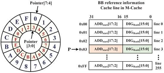In general, the width of a 32-bit address can provide 4 GB of address space, where the PC[31:2] value of the BB start address leads to large on-chip storage consumption when it constitutes the integrity reference information of . For this reason, we selected the lower 16-bit effective values from PC, that is, PC[17:2], as the start address value of each BB into , which can provide the applications with up to 256 KB address space. Furthermore, the size of the address space can be extended by selecting more effective bits from PC[31:2] according to the real application requirements, and its storage resource overhead will also increase.