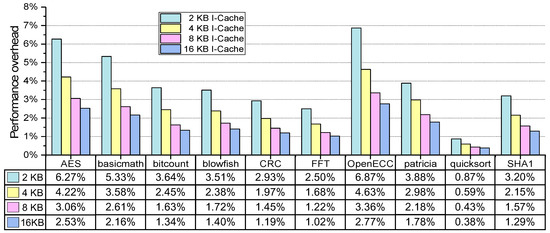 As described above, the instruction monitor is also closely related to the hit rate of the I-Cache. In order to further explore the effects of the I-Cache hit rate on the performance overhead of SPU, we continued the benchmark evaluation experiments by maintaining the 8-KB D-Cache and M-Cache unchanged, and the size of I-Cache is reconfigured as 2, 4, and 16 KB, respectively. The performance overheads of ten selected benchmarks under different sizes of I-Cache are shown in Figure 12. The performance overhead incurred by the SPU decreased with the enlargement of I-Cache addressing space as well as the I-Cache hit rate improvement.