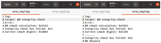 In addition, there were two invalid statuses for the transfer instruction tampering: the SPU first asserted the exception error (“01”) when the current BB integrity checking failed, and then another BB absence (“10”) was reported when the next BB start address (target address of branch/jump) searching missed. We can benefit from the error_logs of both the nontransfer and transfer instruction attacks regarding the BB LHash recognition.