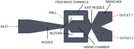 The geometry of the fluidic oscillator considered in this work is that investigated in [14,15], which is presented in Figure 1, showing its constitutive parts and also the employed boundary conditions.