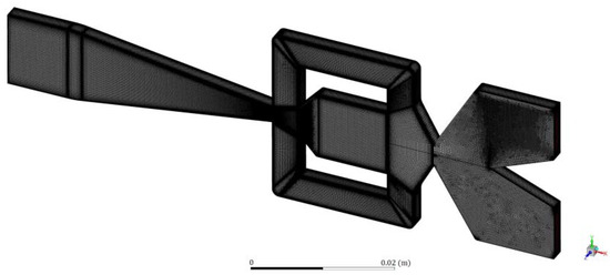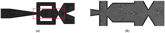 Since the fluidic oscillator has a planar geometry, two-dimensional simulations were performed with the ANSYS Fluent v. 19 commercial software. Preliminary results of a 3D simulation will also be presented in Section 6. The 2D geometrical domain was discretized by means of a structured grid based on quads. To perform the mesh independence study, three grids have been considered in this work: a coarse one with around 105 elements, intermediate 3.43 × 105 cells and refined with 11.75 × 105 elements. Figure 2a shows a panoramic view of the intermediate mesh, whilst Figure 2b is a zoom-in of the red rectangle enclosing the mixing chamber: there, it is seen that the grid is pretty uniform. In this graph it can also be seen that the grid is substantially refined close to the walls in order to resolve the boundary layer, giving maximum values of (Table 1), which is a requirement of the turbulence model used.