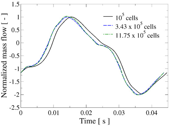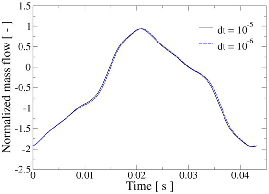 Furthermore, a time-step sensitivity study has been performed for the base case. Two small time steps s have been tested. It can be seen in Figure 4 that there are no significant differences between the two mass flow signals, so a value of s has been set for the time step.