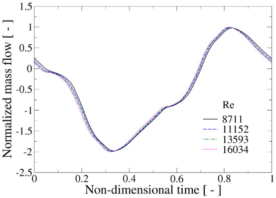 An interesting exercise is to plot the normalized mass flow at outlet 1 versus a non-dimensional time obtained by dividing the real time over the period of oscillation for the four Reynolds numbers simulated. As can be seen in Figure 6, the four curves overlap each other approximately, which means that the non-dimensional frequency of the fluidic actuator is virtually independent of for the studied range of Reynold numbers, between 8000 and 16,000.