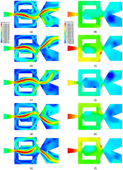 Looking at the right column of Figure 7, it is noticed that pressure grows in the mixing chamber when the jet impinges on the exit nozzle walls; it is maximum when the jet impacts the exit nozzle wall with the steepest angle (e.g., Figure 7b,i) and minimum when the flow directly reaches the exit nozzle. The high pressure values at the impinging points are clearly noticed in Figure h,i,k,l, and the large vortex formed in the outlet branches in Figure 7h,l presents the minimum pressure values. In this way, an oscillation pattern of the pressure field is developed, which is connected with the mass flow cycle (in fact, they have opposite phases), a fact that has been referred to as “axial pumping” [14] in the fluid actuator. Interestingly, previous studies usually report only the behavior of the velocity field, so that the present work is one of the first studies to show explicitly the pressure field cycle inside this kind of device.