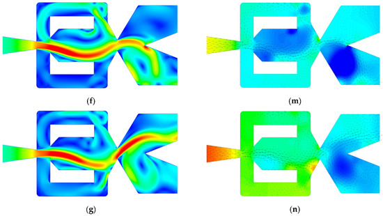The flow development along the fluidic oscillator through a complete oscillation cycle is shown in Figure 7 through velocity and pressure contours. Figure 7 shows on the left column a contour plot of the velocity field at certain instants of the oscillation cycle, where the last row (Figure 7g–n) is the flow field shown in the upper row (Figure 7a–h) after completing one cycle; the right column of Figure 7 shows the corresponding pressure contour plots with superimposed velocity vectors, whose relative length is proportional to the velocity magnitude. The behavior of the velocity field has been extensively described from an experimental point of view [14] and it will not be repeated here; thus, only a brief synopsis will be given.