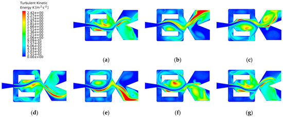 Figure 8 displays the turbulent kinetic energy contour field along one oscillation cycle at the corresponding times of Figure 7. It can be noticed that the highest values of are attained in the mixing layers generated by the jet in the mixing chamber and in the outlet branches, as well as in the recirculation zones that flank the jet between the upper and lower blocks. It is precisely in such areas where large velocity gradients are generated, leading to substantial turbulent kinetic energy production. However, in the surroundings where the jet impinges the exit nozzle walls, adopts moderate values because in such zones, turbulent dissipation is high. The large vortical structures developing in the mixing chamber and in the outlet branches are zones of high values of turbulent kinetic energy (see Figure 8a,c,d,f,g), as already observed in the study Guzmán et al. [3], which also exhibits low pressure values. In Figure 8b,e, the maximum values of are located within the outlet branches where the jet emerging from the mixing chamber exit nozzle reaches the upper wall (Figure 8b) or lower wall (Figure 8e) of such branches.