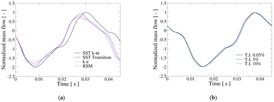 Figure 9 shows the normalized mass flow profiles at outlet 1 in the base case at . As can be seen in Figure 9a, there are some differences between the additional tested turbulence models, but all of them provide a shorter period than the SST k-ω model. This situation is similar to what happened in [15], where the other employed turbulence models (k-ω, k-ε, RNG k-ε and k-ε EARSM) also provide larger oscillation frequencies than the SST k-ω. In the present study, all the alternative models provide mass flow curves which are very similar in shape but showing some noticeable differences in their peak values. Moreover, the three investigated turbulence models present curves without inflection points in the ascending and descending branches, while the SST k-ω model shows two of such points in these branches (i.e., around times 0.02 s and 0.04 s). Although not shown, such particular points appear when no flow crosses one of the two outlets. As a comment, the value of the time step necessary to obtain a converged solution using the k-ε and RSM turbulence models is notably smaller than for the SST models (k-ω and transition).