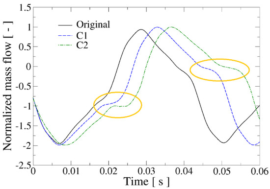 The grids of the modified configurations are similar in size and quality to the intermediate mesh of the original fluidic oscillator. In the C1 case, it consists of about 328,000 cells, whereas in the C2 case, it is around 314,000 cells. The numerical set up employed for these new configurations was the same as in the original case described in Section 2, including the turbulence model. Figure 11 shows the normalized mass flow through outlet 1 versus time for the three geometrical configurations: original, C1 and C2 at . It can be seen that as the feedback channels get rounder, the frequency of the oscillation decreases (i.e., the period is larger) and the mass flow curve is flattened in some parts of the increasing and decreasing branches (see areas inside the ovals in Figure 11) containing the inflection points; even in the C2 case, a plateau seems to be formed. On the other hand, the minimum and maximum values of the normalized mass flow in the three curves are very similar.