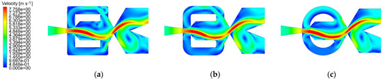 Figure 12 shows velocity contours in the three geometrical configurations at approximately the same moment in the oscillation cycle, when the jet is bended downwards and the fluid is mainly divided between the exit nozzle of the mixing chamber and the upper feedback channel. Very similar flow patterns for the three geometries are observed at the outlet branches, with a large vortex in the lower branch and with very similar intensity. However, differences can be noticed in the upper recirculation loop, where the original (Figure 12a) and C1 (Figure 12b) configurations clearly show separated flow at the inlet corner of the feedback channel, but the fluid in the C2 configuration (Figure 12c) attaches to the outer wall of the loop without presenting any separated vortices. Moreover, the velocity magnitude within such vortices is lower in the C1 geometry, its shape being more elongated than in the original case; in other words, the vortex is stretched to conform to the rounded walls. Another vortex is visible in the original configuration, close to the lower right corner of the upper block and near the entrance of the upper feedback channel; such a vortex is not so evident in our configurations, possibly due to the rounded corners.