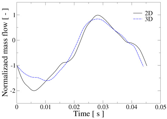 The normalized mass flow through outlet 1 as a function of time is shown in Figure 14. As a result, the computed operating frequency in the 3D case was somewhat higher than in 2D, similar to the findings of Krüger et al. [15]. It can be seen that the peaks of mass flow are smaller in the three-dimensional simulation than in the two-dimensional one, a fact probably related to the strong secondary flows observed in the outlet branches of the former, which are out of reach for the latter. Moreover, the position of the minimum of the curve is noticeably displaced in time in both simulations; however, the location of the maximum is quite similar in both curves. Another fact to be noticed is that the 3D simulation curve does not show the inflection points previously seen in the 2D computation.
