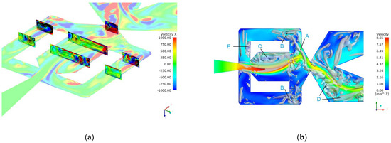 Figure 15a shows the vorticity in the flow direction (x-axis) in the mid plane of the device. Moreover, some vertical planes cutting the feedback loops and the mixing chamber are included, which are also colored by the x-component of the vorticity, . In them, some streamlines of the secondary flow are drawn, illustrating the complex three-dimensional flow structure in both the mixing chamber and the recirculation channels. The highest absolute values of appear in the mixing layer formed when the jet enters the mixing chamber, the strong recirculation zones in the mixing chamber, the entrance in the feedback channels, and upstream and downstream of the exit nozzle, including the corresponding outlet branch.