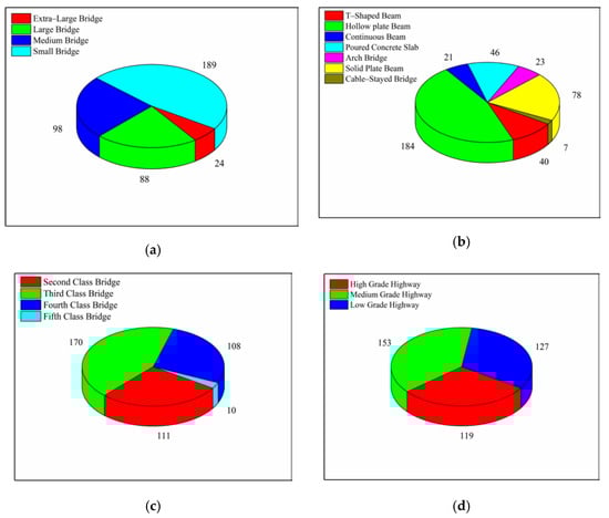 The classification standards of highway grades are based on the Chinese “Technical Standard of Highway Engineering (JTG B01-2019)” and are divided according to the design service life of the highway on which the bridge is located []. The details are presented in Table 1. The technical condition grades are classified according to the Chinese “Highway Performance Assessment Standards (JTG 5210-2018)” and are divided according to the weighted score of the overall technical conditions of the bridge []. The details are presented in Table 2; “Highway Bridge Design standard” is the reference standard for classification of bridge grades and the details are presented in Table 3 [].