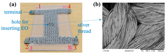 (a) Textile-based microfluidic platform used for the determination of different essential oils, (b) SEM micrograph of knitted silver threads.
