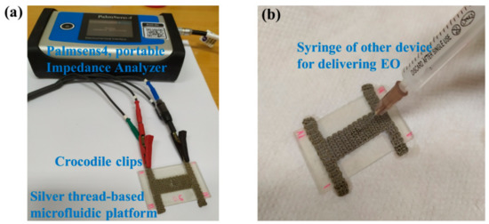 (a) Experimental setup for EIS, (b) injection of EO solution onto the sensing part of the device.