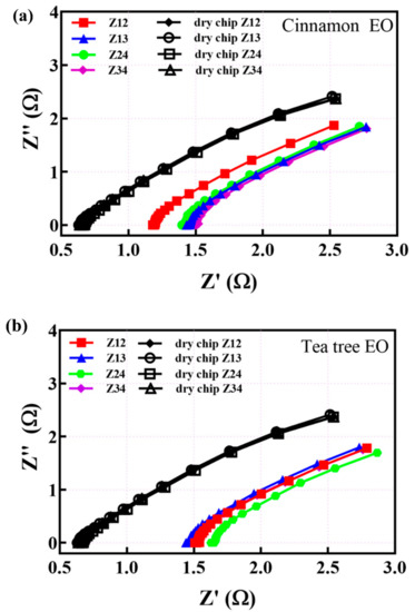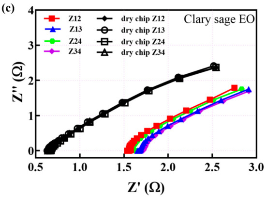 The impedance measurements were performed on our fabricated textile-based microfluidic platform for each type of EO in different concentrations. Firstly, a dry platform (dry chip) was applied without delivering any solution, followed by the application of EOs to detect differences in the modulus of impedance. The tea tree, clary sage, and cinnamon bark EOs, at 0.2% concentrations, were studied. Figure 3 presents Nyquist plots of the studied EOs, presenting an imaginary part of impedance (Z”) as a function of a real part of impedance (Z’) measured at four terminals, as labeled in Figure 1 (at the same sides, Z12 and Z24, and diagonally, Z13 and Z24).
