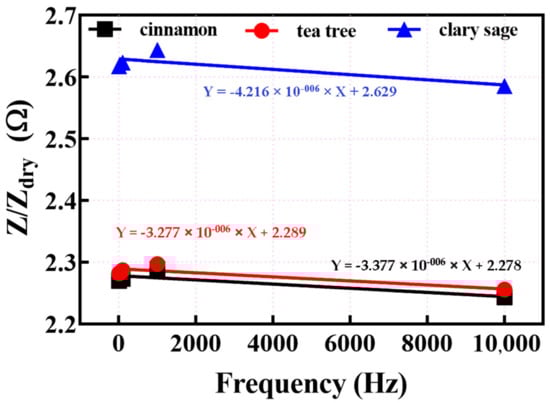 We performed a linear regression analysis of the curves shown in Figure 4. Using the ratio presented in Figure 4, at four frequencies (10 Hz, 100 Hz, 1 Hz, and 10 kHz), linear equations were determined, followed by R2 calculations. Equations are included in Figure 4. With the calculations of R2 values, we wanted to compare the linearity of curves for three different EOs. We observed very close results for all three EOs (0.8045, 0.7088, and 0.7307 for tea tree, clary sage, and cinnamon, respectively), indicating that the proposed platform is suitable for all three tested EOs. Finally, using measuring data at a frequency of 5 kHz, which was not included in the initial data fitting, relative errors were determined—0.299, 0.026, and 0.307% for tea tree, clary sage, and cinnamon, respectively. Additionally, the limit of detection (LOD) and the limit of quantification (LOQ) were calculated and the results are presented in Table 1. They were calculated as follows: LOD = 3.3 * (standard deviation of the Y-intercept of regression line/slope), LOQ = 10 * (standard deviation of the Y-intercept of regression line/slope).