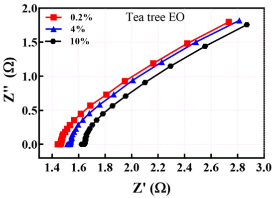 Increasing the concentration of essential oil resulted in a higher electrical resistance. The reason for this behavior can be ascribed to two effects. The first one was that increasing the ratio of EO compared to ethanol and water resulted in a decreased number of ions that could participate in the current flow, which led to a decrease in the conductivity. The second reason could be due to the difference in dielectric properties. It is known that the dielectric constant (relative permittivity) of water is around 80; for ethanol, it is around 22; and for EOs, it is around 2 [27,28]. This means that increasing the concentration of EOs will decrease the dielectric constant and consequently decrease the capacitive part of the impedance. Bearing in mind that capacitance and impedance are inversely proportional, this resulted in increasing the real part of the impedance by increasing the concentration of EO. The observed increase in resistivity from Nyquist plots is confirmed by the calculated RMSD values—34.65, 40.86, and 51.36 for concentrations of 0.2%, 4%, and 10%, respectively.