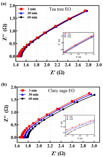 Furthermore, we analyzed the change in Nyquist plots caused by increasing the time of exposure of the proposed platform to the influence of the EOs. Figure 6 presents the variation in Nyquist plots for tea tree and clary sage essential oil measured at the pair of terminals 1 and 3 at the beginning of measurement (initial measurement) and at 30 min and 60 min for a 0.2% concentration of EOs.
