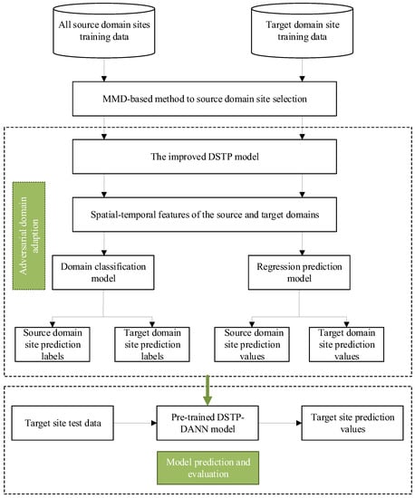 In this paper, a hybrid transfer learning model is proposed. The input of the model includes historical air quality and meteorological data of source and target domains. Firstly, the source domain site selection method based on MMD is used to find the source domain site closest to the target domain. Then the data of the two sites are input into the improved DSTP model together. A feature extractor based on the DSTP model is used to extract the spatial–temporal features of training data from source and target site data. The obtained spatial–temporal features are input into the domain classification model and the regression prediction model, respectively. In this paper, a domain adversarial neural network (DANN) is used to find the domain invariant features between the source domain and the target domain through adversarial domain adaptation of DSTP feature extractor and domain classifier. Finally, the regression prediction model based on the fully connected layer is used to predict the values of the source and target sites. The test data of the target site are input into the pre-trained DSTP-DANN model for PM2.5 concentration prediction. The framework of the proposed model is shown in Figure 1, which will be described in detail below.