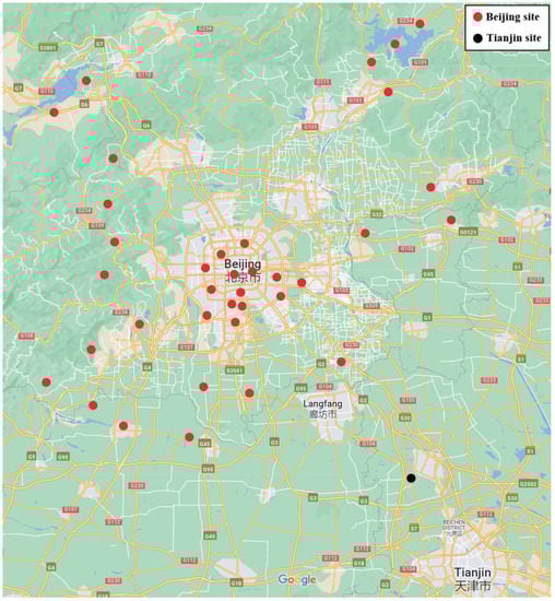 The dataset used in this paper was collected by Microsoft Research’s Urban Air project []. We select datasets related to Beijing and Tianjin to evaluate the proposed TL-DSTP-DANN neural network. The distribution of monitoring sites in Beijing and Tianjin is shown in Figure 3, where the red points are all the sites in Beijing, and the black point is the Tianjin site to be predicted. For reasons of data collection, the historical data of the Tianjin site are only one month, and the historical data for the Beijing sites are from 1 May 2014 to 30 April 2015 (1 year, 8759 data). Because the data of Tianjin site are very few, the training effect is not good if they are directly used. This paper investigates how to use data migration learning from all sites in Beijing to predict PM2.5 concentrations at the Tianjin site. The dataset collects air quality records from 36 sites in Beijing and 1 site in Tianjin. Each air quality record contains six pollutants: PM2.5, PM10, SO, NO, CO and O. Each weather record contains seven items: time, weather, temperature, pressure, humidity, wind speed, and wind direction. Table 1 shows the details of the datasets used in this paper. There are very complex relationships among these factors []. It is the main reason why the deep learning-based method is used in this study.