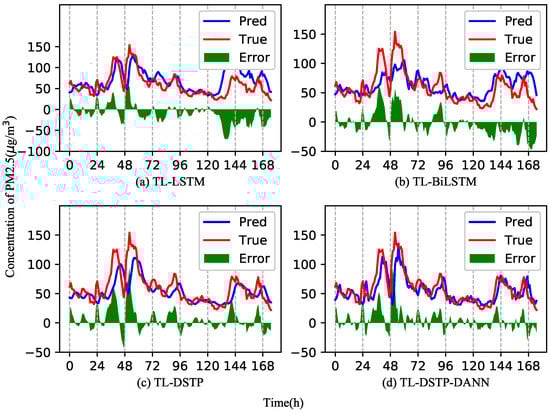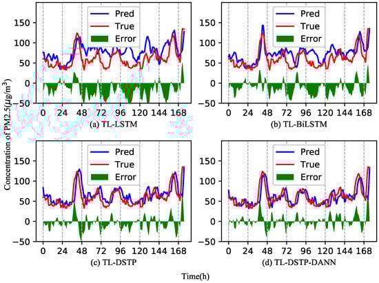 To verify the performance of the proposed method, the true and predicted values of PM2.5 concentrations at the Tianjin site predicted by the four models from 23 April 2015 to 30 April 2015 are shown in Figure 4. As can be seen from the figure, compared with the TL-DSTP and TL-DSTP-DANN models, the predicted values of TL-LSTM and TL-BiLSTM models are quite different from the true values. At the same time, the error between the predicted value and the true value of the TL-DSTP-DANN model is smaller than that of TL-DSTP.