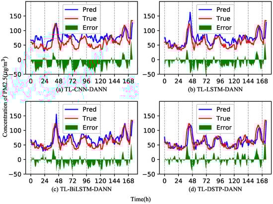 The results show that the TL-CNN-DANN model is the worst because CNN is more suitable for extracting spatial features. The TL-LSTM-DANN model performs better than TL-CNN-DANN because the LSTM model can better extract temporal features of long time series than the CNN module. The TL-BiLSTM-DANN model performs better than the TL-LSTM-DANN because the BiLSTM considers the information contained in subsequent time series to adjust modeling and computation. The TL-DSTP-DANN model has the best performance compared to other DANN-based structures, mainly because DSTP can extract spatial–temporal features. The models using different feature extractors to predict PM2.5 concentrations at the Tianjin site are shown in Figure 5, from which it can be seen that the TL-DSTP-DANN model has the smallest error between the predicted and true values.