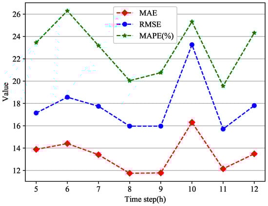 Reasonable setting of the time step has a great influence on experimental accuracy and speed. The larger the value of time step is, the more the characteristics of the sample it contains. However, the influence of past data on the current PM2.5 concentration will become weaker and weaker with the increase of the time step. If the time step is too large, it will lead to the reduction of the experimental accuracy. At the same time, the time of experimental training will increase with the increase of the time step. To get an appropriate setting of the time step, some experiments are conducted. The experimental results corresponding to different time steps are shown in Figure 7. It can be seen from the figure that the comprehensive performance of the proposed model is the best when the time step is 8. Thus, the time step is set as 8 in this study.