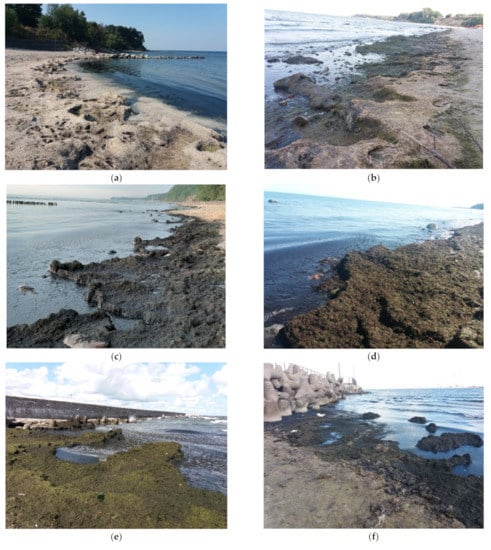 Algae casts of large volume, the layer thickness exceeds 0.15 m: (a) Zaostrovye settlement from the east side of Cape Gvardeisky, 28 August 2019; (b) coast, west of the mouth of the river Zabava, 31 August 2019; (c) Otradnoe settlement, 20 June 2020; (d) Filinsky Bay, 10 July 2019; (e) the western part of the beach in Baltiysk, 17 July 2019; (f) Western part of the Pionersky beach, 25 July 2019 (photos by J. Gorbunova).