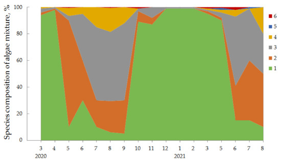 The Elemental analysis of algae biomass was performed using an Elementar Analysensysteme (Elementar Analysensysteme GmbH, Langenselbold, Germany) CHNS-elemental analyzer Vario EL Cube model. Weighing was carried out on an analytical balance with an accuracy of 0.01 mg. The element content was calculated using a calibration straight line constructed from standard compounds based on the area of the chromatographic peaks of N2, CO2, H2O, and SO2. Each sample was analyzed with three independent measures, and the mean values are presented. The analytical data were processed and the element content of the sample was calculated using the instrument manufacturer’s software.