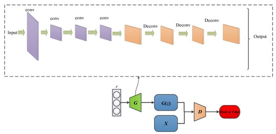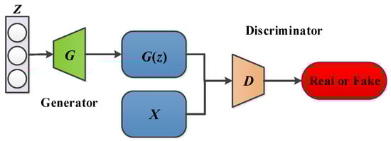 The main structure of GAN includes a generator and a discriminator [,]. The generator is used to generate real samples, and the discriminator is used to determine real samples and fake samples. The generator inputs a random noise vector (usually uniform or normal distribution) and maps it to a new multi-dimensional data space to achieve a generated fake sample . The discriminator is used to perform classification and to calculate the probability that the testing sample is a real sample. In the training, the generator tries to learn the data distribution of the real sample to generate a fake sample, and the discriminator tries to distinguish the generated fake sample from the real sample. The objective function of the generative adversarial network is as follows: