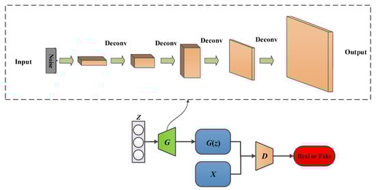 With the continuous intensive research in the field of image and sample generation by the Generative Adversarial Network, many excellent image and sample generation algorithms have emerged. Radford et al. [] proposed a Deep Convolutional Generative Adversarial Network. By improving the neural network structure in the GAN model, the deconvolution layer innovatively replaced the fully connected layer of the generator in the basic GAN network, thus achieving excellent performance in image generation tasks. As shown in Figure 2, the powerful feature extraction capability of CNN in DCGAN is adopted to improve the learning effect of the generative network. By use of Batch Normalization (BN) in the layer, the generator can learn stably, so that the model can learn better data sample distribution and more stably generate high-quality samples.