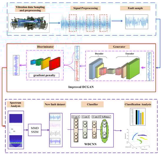 Therefore, how to solve the problems of a small sample, insufficiently labeled data, and low diagnosis accuracy has become the top priority in fault diagnosis and identification. Generative Adversarial Network (GAN) as an artificial intelligence method provides a good technical means to solve this problem [,]. Its unique adversarial idea makes it stand out among many generator models, and it has wide applications in sample generation, data enhancement, and other fields. In the Generative Adversarial Network, the existence of the generator means that the sample size and completeness are no longer the key factors that affect the accuracy of the entire network. Luo et al. [] proposed a new generative adversarial learning model to deal with the fault diagnosis of rotating machinery. The generator can generate fault data with higher reliability to improve the fault diagnosis dataset. Wang et al. [] aimed at the problem of sample imbalance, obtained the fault characteristics of the signal through GAN, and generated new fault samples. Viola et al. [] proposed a generative model based on Generative Adversarial Networks to generate synthetic samples that conform to the original data sample distribution, and extended training samples to solve the overfitting problem of the classification model due to insufficient training samples. Li et al. [] used the Enhanced Generative Adversarial Network to compare the probability distribution between the generated signals and the real signals, and generated the fault signals for rotating machinery fault diagnosis.