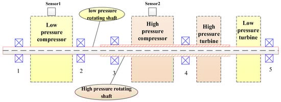 To further verify the performance of the proposed method, the gas turbine rotor system fault experiment from the test bench is adopted. The rotor system of a gas turbine is shown in Figure 5, which is mainly composed of a compressor, turbine, rotating shaft, and so on. The low-pressure turbine is connected to the low-pressure compressor through the low-pressure rotating shaft, and the high-pressure turbine is connected to the high-pressure compressor through the high-pressure rotating shaft sleeved on the low-pressure rotating shaft. Due to the complex and high-temperature internal environment of gas turbines, the whole machine vibration measurement is often used in the engineering application. Through multiple experiments and analyses at different positions and angles, as shown in Figure 5, a speed sensor (sensor 1) is installed on the radial position at the front end of the low-pressure compressor casing as the front measuring point, a speed sensor (sensor 2) is installed at the radial position of the casing between the high-pressure compressor and the combustion chamber as the back measuring point, and the rotor speed sensor for measuring high- and low-pressure rotor speed is installed inside the gas engine. The numbers 1–5 in the Figure 5 are the support points for high- and low-pressure rotor, among which, 1, 2 and 5 are the low-pressure rotor support points, and 3 and 4 are the high-pressure rotor support points.
