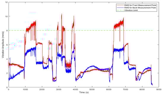 The sampling frequency is 6000 Hz, and the experiment time lasts 8000 s. In the actual operation of the gas turbine rotor system, the time domain statistics in the vibration signals will change with the change in the working conditions and state of the gas turbine rotor system. Therefore, the time domain analysis of gas turbine rotor system vibration signals can be used to preliminarily observe and judge the state and trend of the rotor system, and further for the gas turbine rotor system fault diagnosis and analysis. The vibration signals collected by the gas turbine sensor are shown in Figure 6, and the effective values of gas turbine vibration signals in the time domain can be obtained. From Figure 6, it can be seen that the amplitude of the front measuring point vibration data is large and exceeds the limit in some time periods, and by analysis, it can be concluded that faults may occur. For further analysis, the root mean square (RMS) values of vibration signals are calculated and shown in Figure 7.