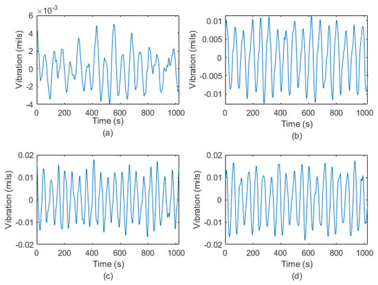 Different vibration signals for gas turbine rotor system faults. (a) Normal state. (b) Airflow excitation. (c) Unbalanced. (d) Misalignment.