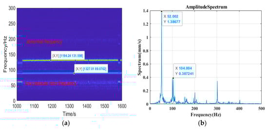 The time–frequency analyses of gas turbine rotor system vibration signals under misalignment and unbalanced states are shown in Figure 9. It can be seen from Figure 9a that the abnormal frequency (131.5 Hz) is about 1.47 times the low-voltage rotating frequency (89.1 Hz), and the frequency is not fixed. After preliminary judgment, it is determined as faults by rotor misalignment. In addition to the abnormal frequency associated with excessive vibration, the double frequency component 101 Hz of low-pressure rotor frequency 52 Hz appears when the high speed drops to slow speed, as shown in Figure 9b. By analysis, this may be caused by the rotor unbalanced. After discussion and consultation with experts, it was preliminarily determined that the abnormal frequency and the reasons for vibration exceeded the standard. Through examining actual faults and machine maintenance, the fault type was determined, and the label was given as the experimental sample.