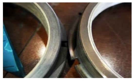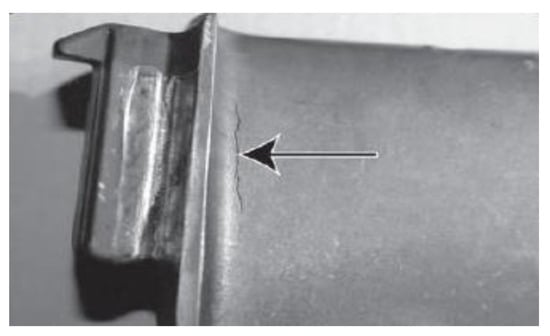 The rotor misalignment could cause the radial double frequency vibration, and axial vibration of the rotor could cause the fatigue damage of the shaft, as shown in Figure 10. If the rotor misalignment lasts for a long time, it will aggravate and cause other more serious faults; thus, it must be effectively identified. The gas turbine rotor system unbalance will directly lead to excessive vibration of the whole machine, which will cause a series of deformed or even damaged elements. The deformation caused by vibrations will produce rub impact, leading to fatigue damage of the rotor or other parts, such as the fatigue crack shown in Figure 11.