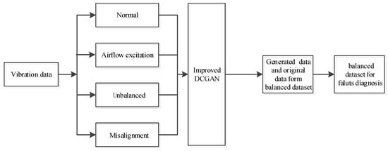 In traditional Generative Adversarial Networks, random data are used as the encoding source to generate samples. In order to improve network training stability and the generated signals’ quality, the inputs introduce fault features in relation to the original signals. According to the Improved DCGAN structure and optimized loss function, an improved method is proposed, which can be applied to gas turbine rotor fault diagnosis under different unknown conditions with small labeled samples, with the purpose of generating effective sample data and supplying a dataset for fault diagnosis. Figure 4 is a flow chart of the proposed gas turbine rotor fault diagnosis method. The whole process is summarized as follows: