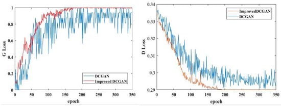 DCGAN improves the GAN structure, and greatly improves the stability of GAN training and the quality of generated data [,]. Its main improvements are as follows: Convolutional Neural Network is used instead of the original GAN generator and discriminator network structure; in the generator network, micro-step convolution is used instead of pooling layers and fully connected layers; and in the discriminator network, step-size convolution is used instead of pooling layers and fully connected layers. Batch normalization unified operations are added to both the generator network and the discriminator network, and in order to prevent the oscillation and instability of CNN, batch normalization unified operation is not added to the output layer of the generator network or the input layer of the discriminator network. The tanh activation function is used in the output layer of the generator network; the ReLU activation function is used in all rest layers. In the discriminator network, the LeakReLU activation function is used instead of the ReLU activation function to solve the vanishing gradient problem when the discriminator network returns to the generator network. DCGAN greatly improves the stability of GAN training and the quality of the generated results.