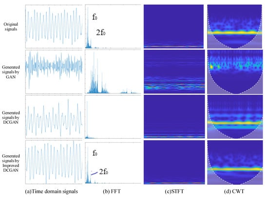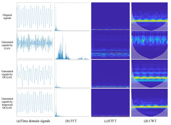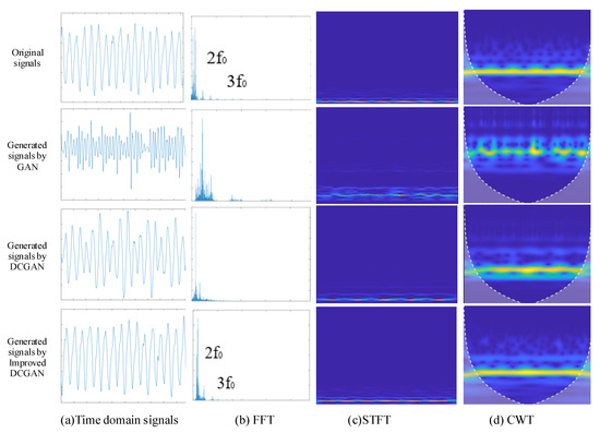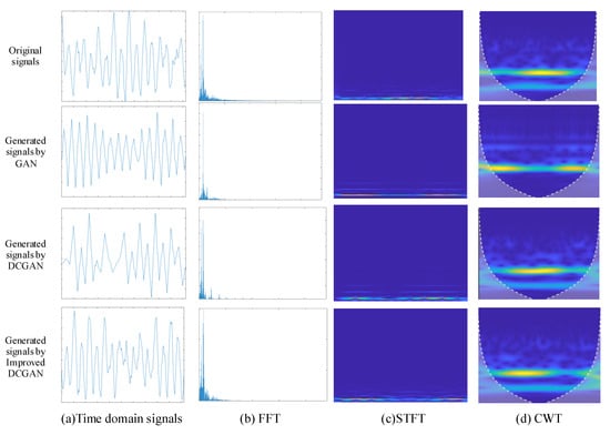 Figure 16 shows the generated gas turbine rotor fault sample signals under the unbalanced state, it can be seen that the generated samples by the proposed method had higher similarity with the original signals than those of GAN and DCGAN. Figure 17 shows the generated gas turbine rotor fault sample signals under the misalignment state generated by GAN, DCGAN, and Improved DCGAN. It can be seen from FFT, STFT, and CWT diagrams that the frequency of the generated samples by Improved DCGAN emerged with double frequency components, which indicates that the generated gas turbine rotor system unbalanced samples are consistent with real samples from the overall trend and can be used as extended samples of the original samples.