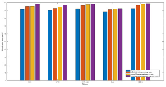 In order to verify the performance of the proposed method, the gas turbine samples are generated by GAN, DCGAN, and Improved DCGAN to form new datasets: dataset with original samples, dataset including generated samples by GAN, dataset including generated samples by DCGAN, and dataset including generated samples by Improved DCGAN. The four datasets are selected to train the classification model and classify the faults with different methods. Table 6 and Figure 18 display the classification accuracy comparisons of different diagnostic methods with the four datasets. When SVM is adopted, the classification accuracies of the dataset with original samples, the dataset including generated samples by GAN, the dataset including generated samples by DCGAN, and the dataset including generated samples by Improved DCGAN are 88.25%, 91.05%, 91.9%, and 92.15%, respectively; when LSTM is used, the classification accuracies of the four datasets are 90.05%, 92.25%, 94.3%, and 96.83%, respectively. When DBN and STFT-CNN are used, the classification results greatly improved. It can be seen that the classification effect by WDCNN performs best under each dataset compared with other methods. Meanwhile, it can be seen that the classification accuracy of the dataset with original samples, the dataset including generated samples by GAN, the dataset including generated samples by DCGAN, and dataset the including generated samples by Improved DCGAN are 92.1%, 96.4%, 97.9%, and 98.65%, respectively. It can be concluded that the classification accuracy of the dataset including generated samples by the Improved DCGAN method obviously increased compared with the dataset including generated samples by GAN and the dataset including generated samples by DCGAN.