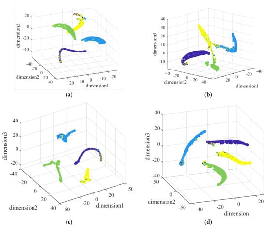 For the sake of displaying the classification results of the fault datasets by these methods, the visualized t-distributed Stochastic Neighbor Embedding (t-SNE) diagrams [] are shown in Figure 19. Purple dots represent normal samples, blue dots represent airflow excitation fault samples, green dots are unbalanced fault samples, and yellow dots are misalignment fault samples. It can be seen in Figure 19a that the original samples without generated samples are mostly classified, unbalanced fault samples and misalignment fault samples are gathered together and not well separated, and some airflow excitation faults are misclassified. Figure 19b displays the classification results of the dataset including generated samples by GAN; it can be seen that the classification results improved. Figure 19c displays the classification results of the dataset including generated samples by DCGAN; the four types of samples are effectively separated, although some misalignment fault samples are classified as normal samples. In Figure 19d, the classification results of the proposed method are the best, with most samples classified correctly.