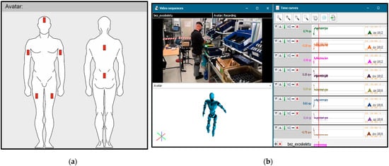 The setting and implementation of the measurement in the industrial workspace: (a) Placement of the Captiv wireless sensors on the body for experiments with and without exoskeleton; (b) The captured data with Captiv sensor system before their evaluation, with synchronization of data and video recording, and avatar visualization.