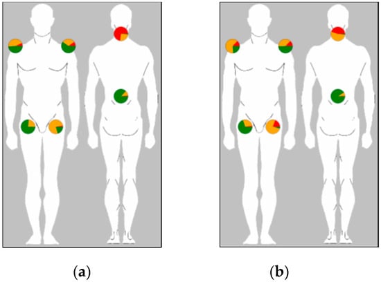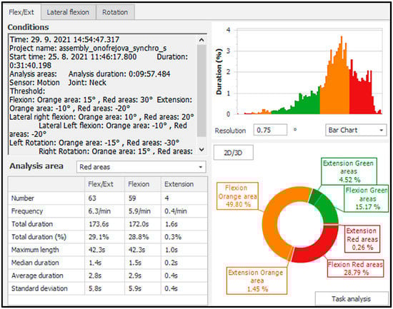 The obtained results correspond to the periods when the subject’s exposure to the risk was greater than the acceptable threshold. Figure 3 shows the level of activity in the colors (green: appropriate, orange: indicates a change in activity, red: inappropriate). The results in Figure 3a show STAND experiments, and Figure 3b shows the EXO experiments. Comparing the results in Table 3 in the neck joint, there was a visible improvement in neck flexion/extension of 34.1%, the angle exceeding 30° in neck flexion was reduced to the level between 15° to 30°, in neck extension from above −20° to the range of −10° to −20°. However, neck rotation was with or without exoskeleton still in the red area over 10% from the total time and even raised in 2% together with orange raised in ~10%.