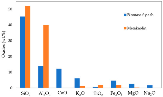 In Figure 1, the chemical composition of metakaolin and biomass fly ash measured as oxides (by XRF) is presented. Metakaolin is mainly composed of SiO2 (52.1 wt.%) and Al2O3 (40.1 wt.%). Other relevant oxides include TiO2 (2.0 wt.%), Fe2O3 (1.9 wt.%), and K2O (1.1 wt.%).