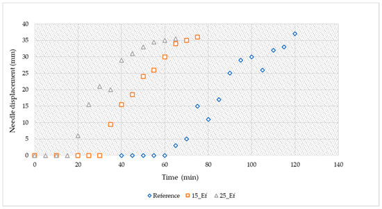 Figure 3 presents the Vicat needle penetration upon curing for the three studied compositions (reference, 15_Ef and 25_Ef). In line with the spread results, increasing the amount of effluent in the compositions decreases the initial and final setting times of the pastes. The initial setting of the reference was 67.5 min, while in the effluent-containing pastes the initial setting was much faster (32.5 min—15_Ef, and 17.5 min—25_Ef paste). The final setting follows the same trend: the setting being 160 min for the reference composition, while for the effluent-containing compositions the setting occurs earlier (105 min and 75 min for the 15_Ef and 25_Ef, respectively).