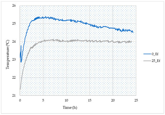 Temperature evolution upon curing measured for the reference and the 25_Ef formulations.