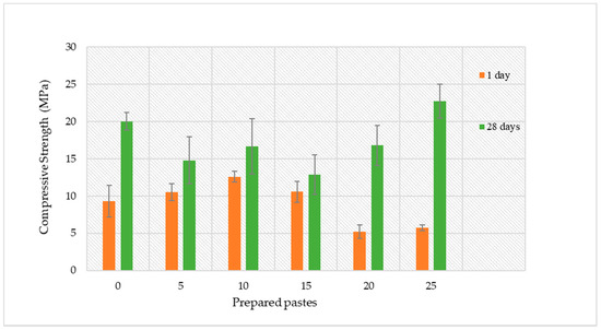 The compressive strength values of the various compositions measured at the 1st and 28th days is shown in Figure 6. The results show that at the 1st day and for incorporation contents up to 15 vol.%, the impact of the effluent on the specimens’ compressive strength is minor, while higher amounts induce a decrease. This might be related to the lower dissolution of Al and Si observed in the dissolution assays (see Figure 4), which cause a delay in the geopolymerisation reactions. The lower strength seen at the 1st day can also be correlated with the lower maximum temperature seen in the calorimetric assays (see Figure 5) for the effluent-containing composition compared with the reference (prepared without adding the effluent). The decrease in the maximum temperature of the pastes can be attributed to the lower alkalinity of the effluent compared with the NaOH, hindering the dissolution of the reactive fraction of the precursors [40]. In fact, previous studies have observed a decrease in the heat evolution (measured by calorimetry) as the ratio of SiO2-to-Na2O of the activating solution rises [41] in line with our results. The higher earlier strength seen for the reference composition is connected with the superior dissolution of Si and Al from the precursors contributing towards the higher strength of these specimens.