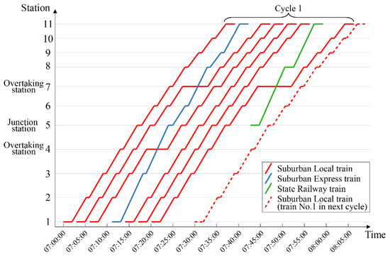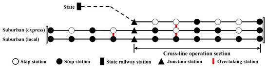 There are two kinds of train routing: state train routing and suburban train routing, and they share the same track of suburban railway line for cross-line operation. State railway trains only stop at the main stations with large numbers of passengers. The suburban train routing takes on the combination of local and express modes. Local trains stop at every station of the line, and the express trains take the skip-stop scheme. The train stop plan is shown in Figure 2. Meanwhile, station No. 4 and No. 7 are set as overtaking stations where express train and state train can overtake local train.